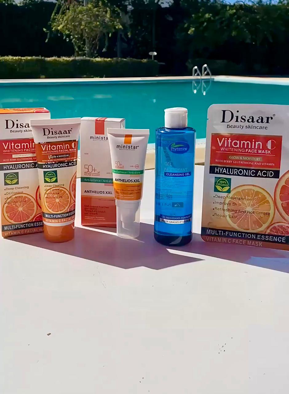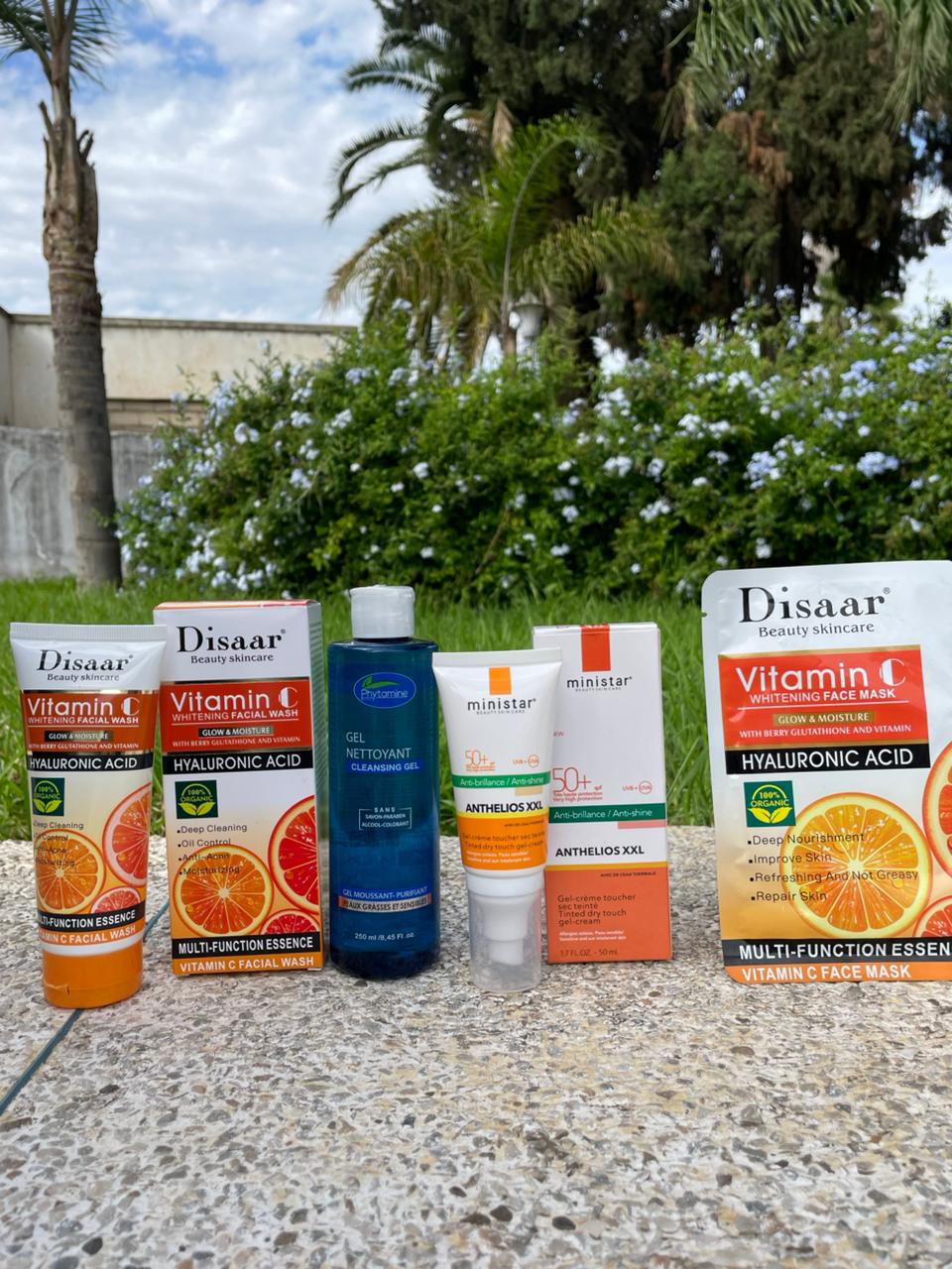 💧 Gel Nettoyant Phytonorm: منظف يومي كيحيد الشوائب والدهون بلا ما يجفف البشرة 🍊 Disaar Vitamin C Wash: غسول غني بالفيتامين C وحمض الهيالورونيك، كيعطي إشراقة ونضارة فورية 🎭 Disaar Vitamin C Mask: ماسك بالفيتامين C يرطب، يغدي ويصلح البشرة ☀️ Ministar SPF50+: واقي شمس بحماية عالية وملمس خفيف